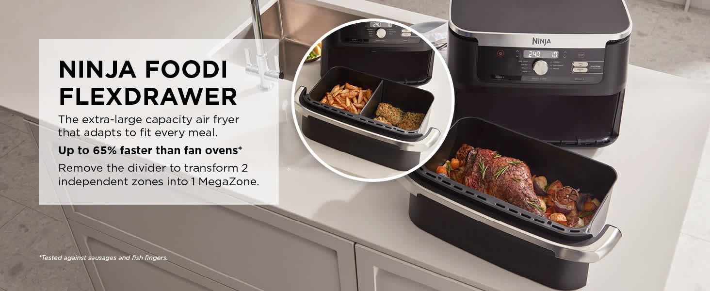 The Ninja Foodi MegaZone AF500UK is the largest Ninja Air Fryer, with a 10.4L capacity - perfect for feeding 8+ people. With the divider in place, you can fit a 2kg chicken or 1.5kg of fries in each zone - or remove the divider to transform into one large drawer!