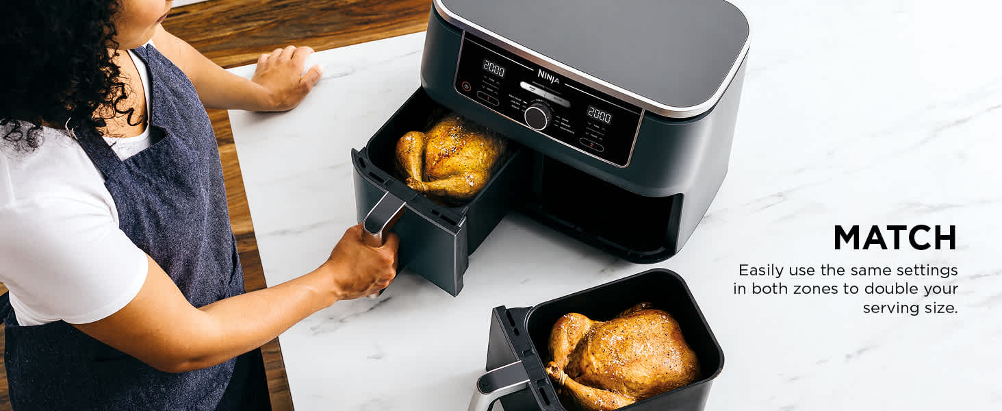 Ninja air fryers are easy to use with clearly marked settings and touchscreen or dial controls. To ensure both sides finish cooking at the same time, simply add your ingredients to each drawer, choose a function, temperature and cooking time for each zone, and press SYNC. To copy the settings from Zone 1 into Zone 2, just press MATCH.
