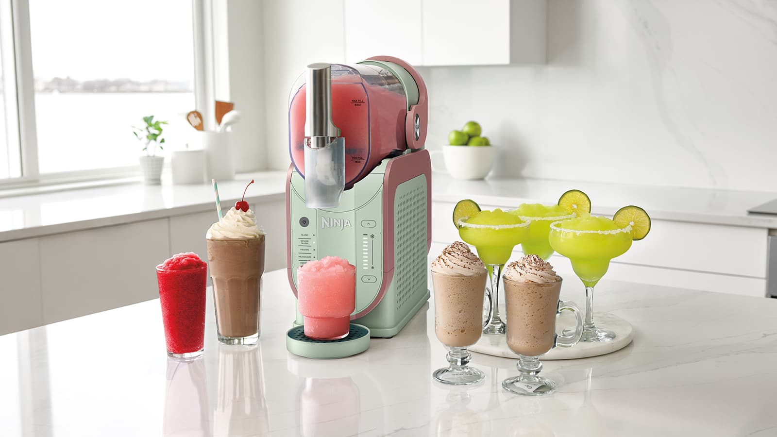 Slush: designed to turn your favourite beverages into fabulous frozen slush Frozen Cocktail: designed for beverages with alcohol content, to create frozen cocktails including margaritas and strawberry daiquiris Frappé: designed to make cool, coffee-shop-inspired frozen frappés Milkshake: designed for dairy, or plant-based alternatives, to create creamier-based beverages, and marvellous milkshakes Frozen Juice: designed for naturally sweetened fruit juices, to make super smoothies.