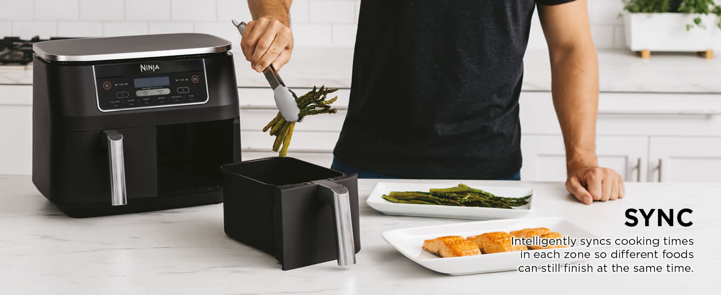 Ninja air fryers are easy to use with clearly marked settings and touchscreen or dial controls. To ensure both sides finish cooking at the same time, simply add your ingredients to each drawer, choose a function, temperature and cooking time for each zone, and press SYNC. To copy the settings from Zone 1 into Zone 2, just press MATCH.