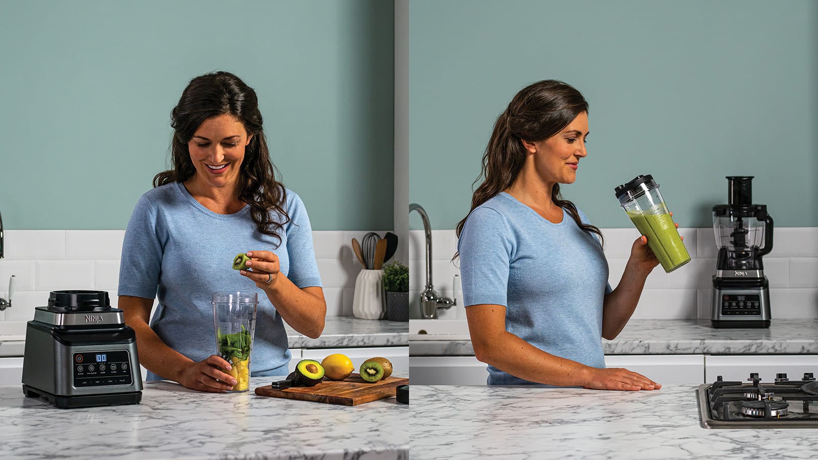 Create anything from dips to drinks, doughs to desserts with this 3-in-1 food processor, multi-serve blender and personal blender.