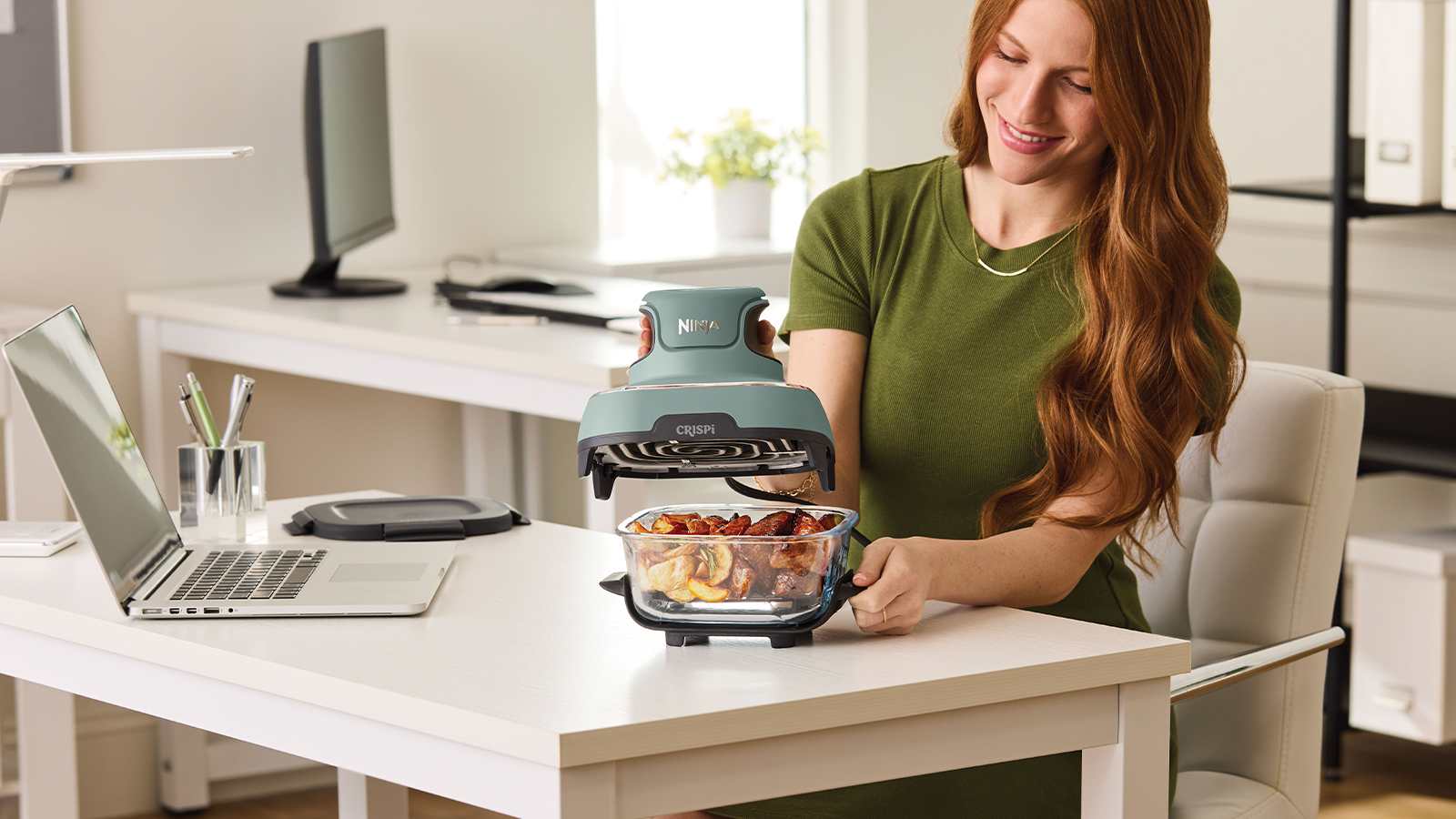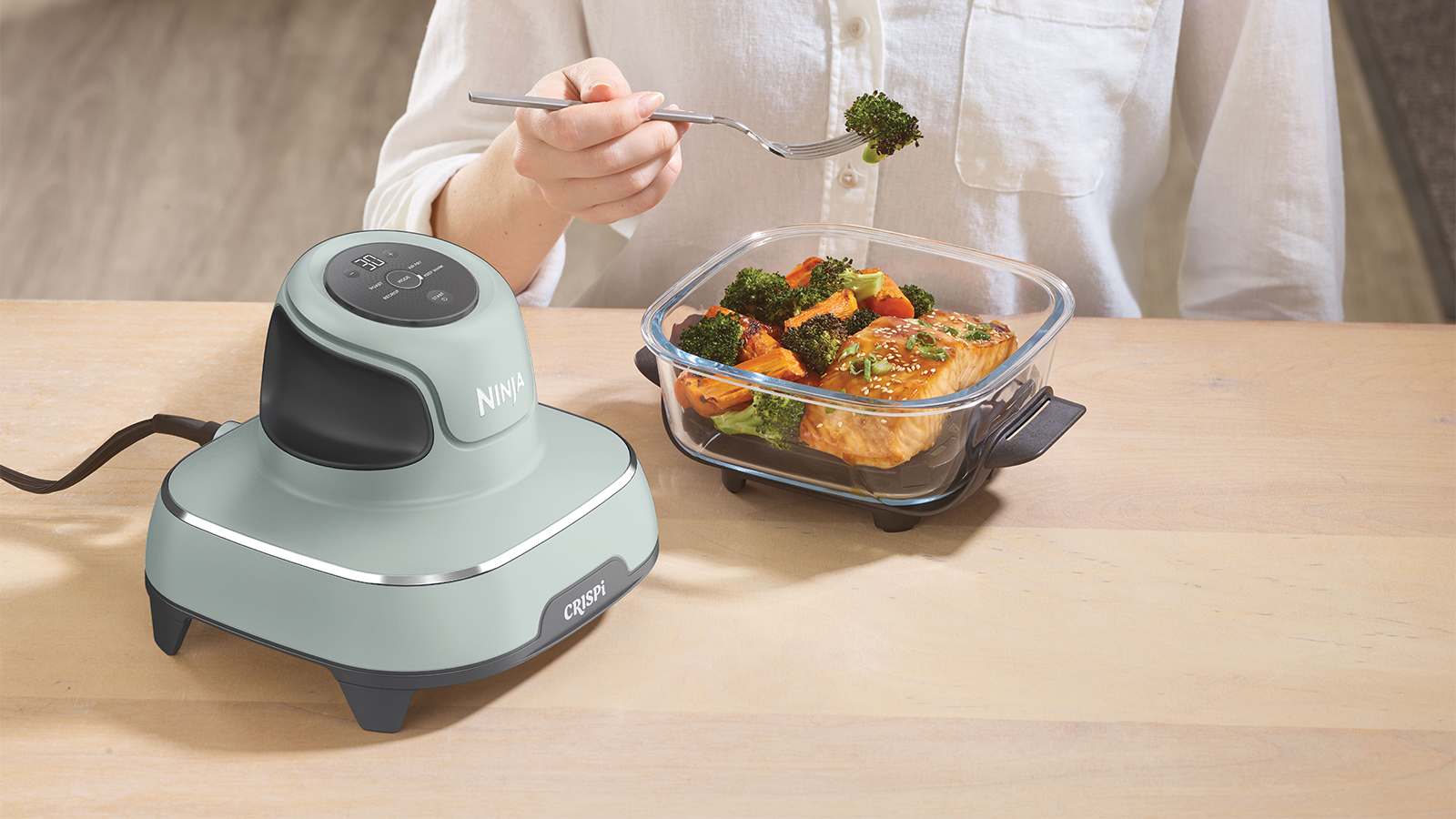 Introducing a Website Exclusive! Ninja CRISPi 4-in-1 Portable Glass Air Fryer - Sage & an additional 3.8L Glass Container.